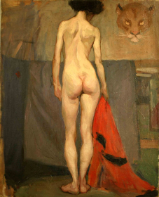 Returning to New York, the Ulreichs moved to Charles Street in Greenwich Village. Ulreich was soon awarded another one-person show at the Dudensing Galleries in New York. The exhibition, comprised of paintings of cowboys, Indians, nudes, and Spanish bullfighters, opened March 14, 1927. Reporting on the Dudensing exhibition, The New York American quoted a somewhat “puffed-up” Ulreich, “There is nothing in New York I care to paint. My interest is in primitive, spiritual things. I hope people will realize that I am stressing the spiritual, imaginative note in my paintings. Why should I paint realistically? I might as well take a good photograph. I have always studied my subject matter before I started to paint. When I wanted to do Indians, I turned cowboy. When I wanted to do bullfighters, I went to Spain and hung around the arena.” The New York Times wrote: “The decorative work of Buk appears from time to time and has always had a refreshing character of its own. It is bold in its big linear patterns and sweeping rhythms that draw many of the designs into swirling movement of complexity. The simpler compositions are usually the best, although in some of the small and intricately patterned paintings there is particular richness and depth of color. The decorative canvases with motifs taken from western life, Indians, animals or prairies have an unconventional and original development of themes that many other artists have rendered in a monotonous, hackneyed manner.”