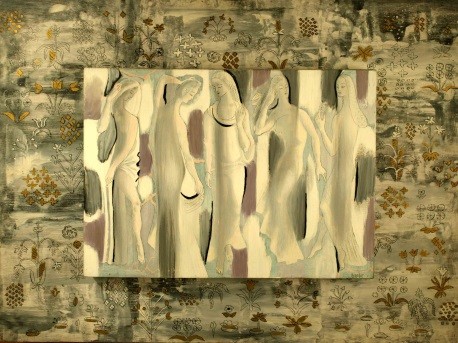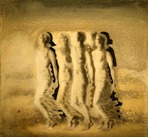 Royal Cortissoz of the New York Herald Tribune writing about the New Dudensing exhibition said: “A blending of the primitive such as one finds in the lyrical grace of a Botticelli, with the methods of an efficient modern, goes far in the paintings of Buk to produce sensations leading to a cordial acceptance of his work. His exhibition at Dudensing Gallery is filled with results of a year’s work abroad, which, while concerned with new ideas he managed to retain interest in the charming decorative themes peculiar to his past invention. Divided into two well-defined groups, the show includes figure paintings, several of them large and ambitiously devised like the extraordinary ‘Music of Spain’ and ‘Woman’ which tend to symbolize an idea rather than interpret reality, and an interesting variety of purely American motives, gleaned no doubt from the back of a memory filled with exciting impressions of Western life. Buk’s feeling for fantasy is eloquently expressed in a painting like ‘Glorious in the Morning Sun’ or ‘Path of Flowers’ where gracefully drawn maidens move in lyrical cadences through landscape of Italianate loveliness. ‘Woman’ on the other hand is a large nude of daring color combination, the gray of the sensitive Botticellian figure being contrasted strongly and strangely, if the truth be told, with its unbroken black background. Yet it is too, a kind of synthesis of the qualities of dignified charm and femininity ideally associated with the subject. In the smaller oils, Buk employs Indian and cowboy motives with particular imaginativeness in designs flatly suggestive of fresco decorating but with a lively and vivid sense of color. This makes a particularly attractive exhibition, giving access to a decorative craftsman of unusual grace and inventive power.”