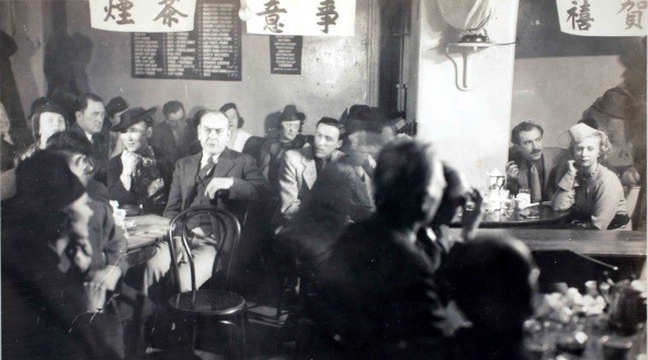 Ulreich (looking at camera) and Nura (woman in hat to the left of Ulreich) at restaurant in Paris, 1926