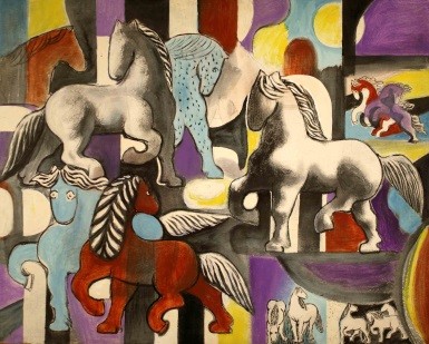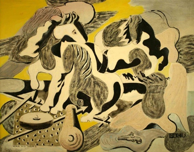 As has been noted previously, while many of the canvases suggested the Cubist influence of Picasso, there was also strong reference to the work of de Chirico. This is especially true in Ulreich’s, War No More in which symbolic objects lay scattered on the ground surrounding the subject horses, suggesting, it seems, that mankind should trample the tools of war beneath its collective feet.