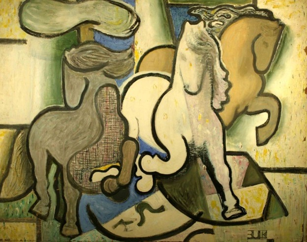 The paintings varied in size, some canvases rather compact, others quite large per the example set by the Abstract Expressionists of the day. Colors employed in many of the paintings did not reflect nature and were used symbolically to convey mood and emotion. The works all shared a relative flatness of perspective and often the subjects were somewhat decomposed in the Cubist style, particularly evident in Parade. Most canvases included groups of horses. Groupings of horses, or previously of female figures, was a recurring element in Ulreich’s work. Whether it was a composition device, or a reflection of Ulreich’s gregarious and outward social nature, or specifically in the case of his horse paintings, a true picture of the social structure of wild horses, is not certain. Observation of Ulreich’s work and life suggests that each element played a role.
