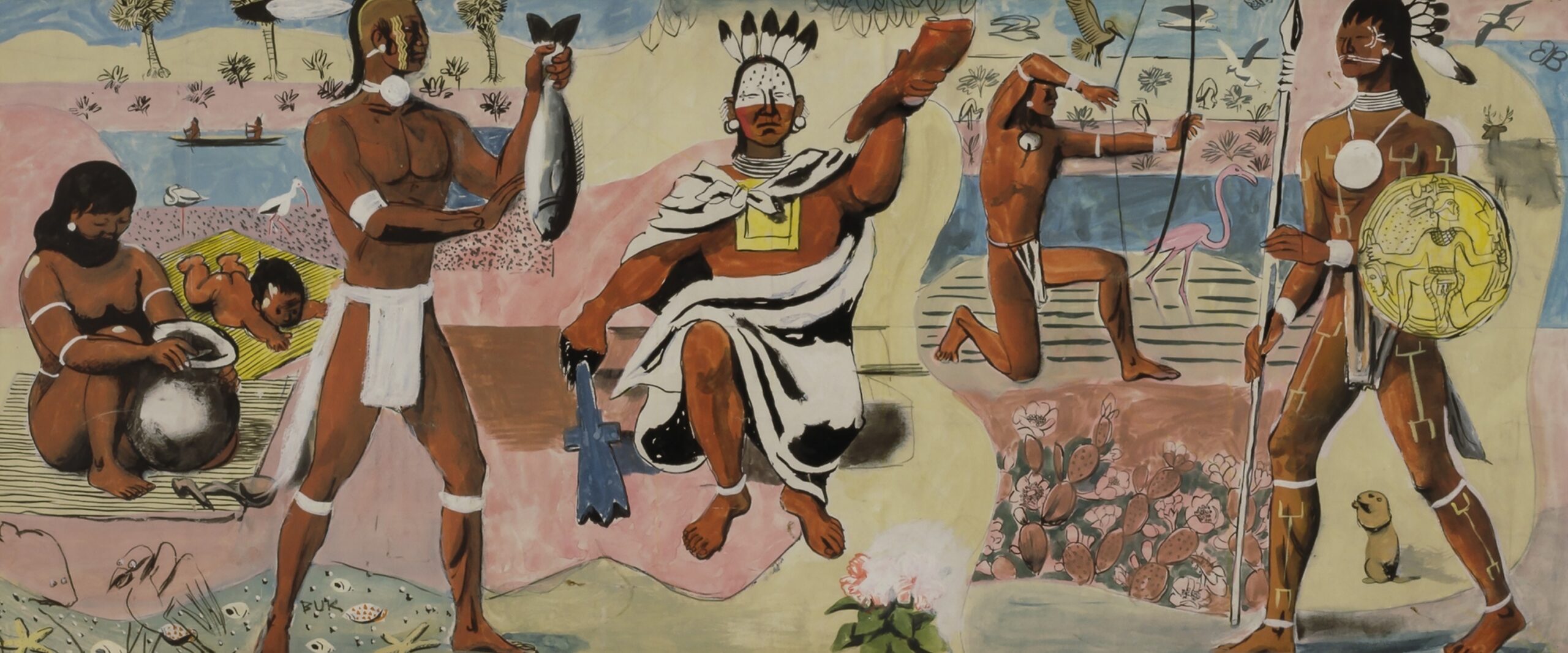 Eight Scenes Depicting the History of Florida: Five Standards on Parade, Aborigine, Juan Ponce de Leon, Saturibo and Ludonniere, Sir Francis Drake, General Andrew Jackson, Osceola and Florida Today (commissioned by Treasury Department, Section of Fine Arts), originally U.S. Post Office and Courthouse Building, now U.S. Bankruptcy Courthouse, Tallahassee, FL. Oil on canvas, each mural approximately 10 X 4 ft. Still on display.